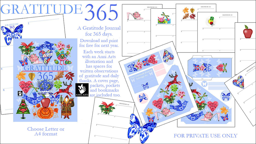 Each new page has a starter image from the Anni Arts illustrations, plus space for a short, daily, written observation of gratitude. Let us focus on what we are thankful for on a daily basis. Week per page. The pages can easily be filed. This is a big file due to the full-colour illustrations, covers and pockets - 11 MB!.